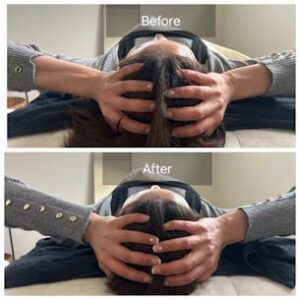 2.【施術】お顔にタオルをかけることで視覚情報をシャットダウンし、外部からの刺激を減らします。「安心して委ねられる環境」を作ることが脳がリラックスモードに切り替わる第一歩です。施術者自身も深い呼吸とリラックスを保ち、目を閉じながら施術を行います。これによりセラピストの脳波とお客様の脳波が共鳴し、自然とα波が引き出され、脳と自律神経が安定しやすい状態へ導かれます。途中で何度か深呼吸をお願いしています。吐く息で副交感神経が優位になり、頭部の筋肉や筋膜が緩むことで、施術効果が一段と高まります。また、無理のない範囲で口をゆっくり開閉していただくことで、咀嚼筋をゆるめ、下顎とつながる蝶形骨をリリース。これにより脳脊髄液の循環が促され、脳の疲労を回復しやすくなります。脳が静まり、思考がクリアになり、眠りにつながる深いリラックスを体感いただけます。