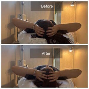 1.【カウンセリング&ミネラルバランス調整】まずは現在の睡眠状態や生活習慣について丁寧にヒヤリング。チェック項目で今の睡眠や自律神経の状態を確認します。バランスミネラルウォーターを飲んでいただき、脳の神経伝達や代謝をサポートし、施術効果を高める土台を整えます。施術前のお顔や頭のお写真を撮ります。